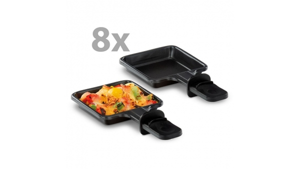 - 8 raclettepannen met antiaanbaklaag en warmte-geïsoleerde handgrepen