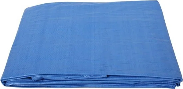 Stevig waterdicht afdekzeil. Het zeil heeft een afmeting van ongeveer 3 x 4 meter en kan met behulp van de bevestigingsogen ook worden vastgesnoerd met bijvoorbeeld een touw. In blauwe kleurstelling.