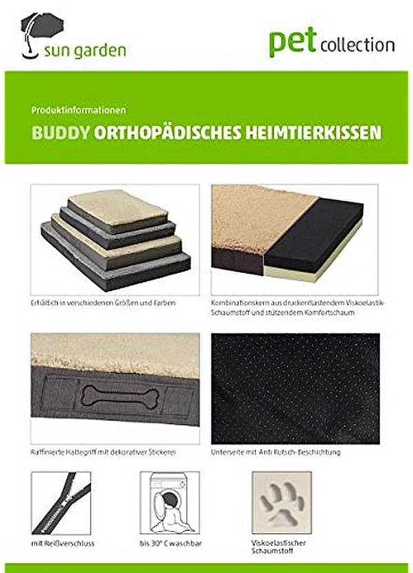 Het Duitse bedrijf Sun Garden, bekend van o.a. kwaliteitsmatrassen en boxsprings heeft nu ook luxe kleden en (orthopedische) kussens voor huisdieren ontwikkeld. Uw hond kan heerlijk ontspannen liggen op het orthopedisch hondenkussen Buddy. Het kussen geeft een optimale drukontlasting voor de wervelkolom en de gewrichten. • Orthopedisch hondenkussen voor optimaal ligcomfort