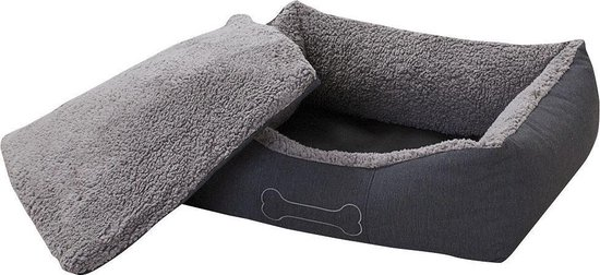 Het extra binnenkussen geeft stabiliteit, Op de voorrand een borduurwerk van hoge kwaliteit van een hondenbot, De hoes van de huisdieren mand is volledig afritsbaar en wasbaar tot 30 ° C, De rits is mooi weggewerkt onder de zijranden, Afmeting buitenmaat ca. 80 x 70 x 20 cm, Getest op schadelijke stoffen, Kleur Zwart/Grijs
