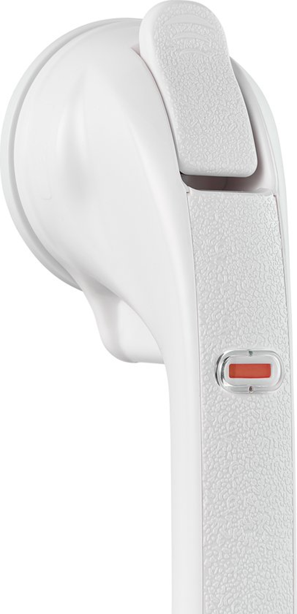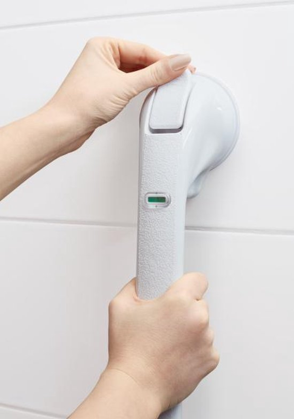 De Quick Mobile Rail is ontworpen om te ondersteunen bij een natuurlijke beweging, bijvoorbeeld als men in en uit de douche stapt. De Quick Mobile Rail is niet ontworpen om het hele lichaamsgewicht te dragen. De mobiele wandbeugel is in enkele seconden, zonder te boren of te schroeven, aan te brengen en te verwijderen. De twee krachtige zuignappen worden stevig op een gladde, niet poreuze en stevige oppervlakte gedrukt, de vacuümhendels worden naar beneden gedrukt en de Quick Mobile Rail zit vast. Als de indicator op groen staat is de beugel goed bevestigd. Indien de indicator half groen / half rood of geheel rood is, geeft dit aan dat de beugel niet goed vast zit. De beugel dient opnieuw te worden bevestigd. Lengte 50 cm. Belastbaar tot 60 kg.