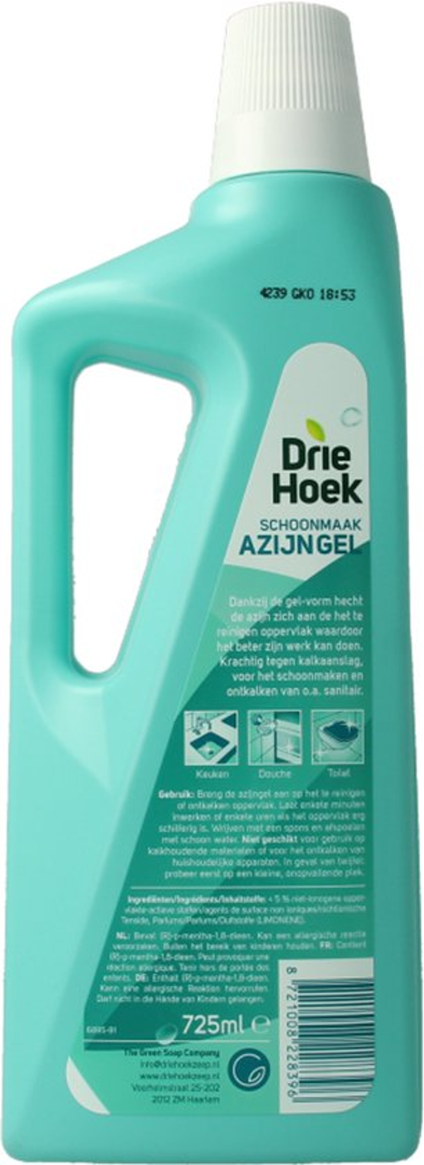De Driehoek Azijn Gel komt in een praktische verpakking van 725ml, wat zorgt voor langdurig gebruik. De gel zelf is gemaakt van natuurlijke azijn, wat het een milieuvriendelijk alternatief maakt voor chemische reinigingsmiddelen.