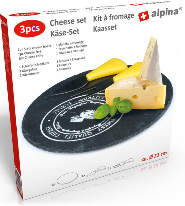 Als dessert, als borrelhapje of zomaar tussendoor. Serveer je kaas op stijlvolle wijze met deze kaasset van Alpina. De set bestaat uit een rond kaasplateau van leisteen met een doorsnee van zo'n 23 cm. Op het plateau staat een nostalgische witte print, die verwijst naar kaas.