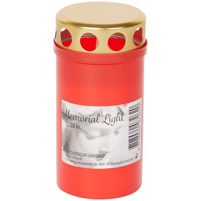 Een kleine herdenkingskaars in rood glas, om een dierbare te herdenken.